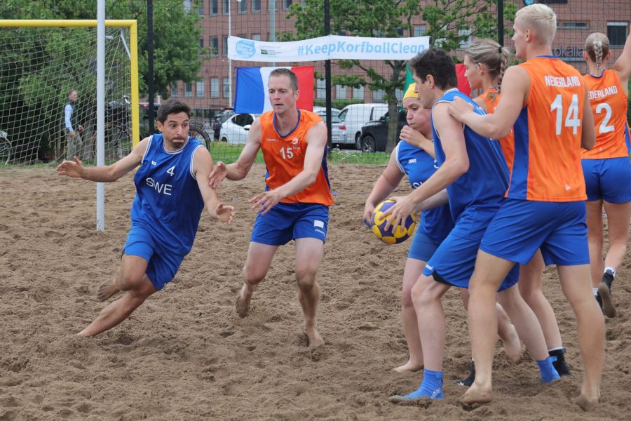 Nederland opende het toernooi met de wedstrijd tegen het thuisland Zweden. Het werd een makkelijke wedstrijd, waarin met name de Nederlandse vrouwen op dreef waren. Lynn Bijkerk opende de score met een tweepunter, waarna Zweden via Anthony Daponte nog counterde met de 1-2. Via nogmaals Bijkerk, Jessie Heuveling en Mandy Koelman liep Oranje vervolgens binnen enkele minuten uit naar 1-5 en bij rust was het al 2-8. Na rust kon Heuveling het verschil naar zeven brengen met een fraaie doorbraakactie en in de fase daarna liep Nederland verder uit. Zweden kon geen vuist maken tegen de Nederlandse dreiging, die van alle kanten kwam. Illustrerend daarvoor was het feit dat in de tweede helft alle Oranje-spelers de korf vonden, waar bij Zweden alleen Carl Hendrik Christiansson wist te scoren. Het werd uiteindelijk 3-15 en daarmee kenden de Nederlandse beachkorfballers een prima opening van het wereldbekertoernooi in Stockholm.